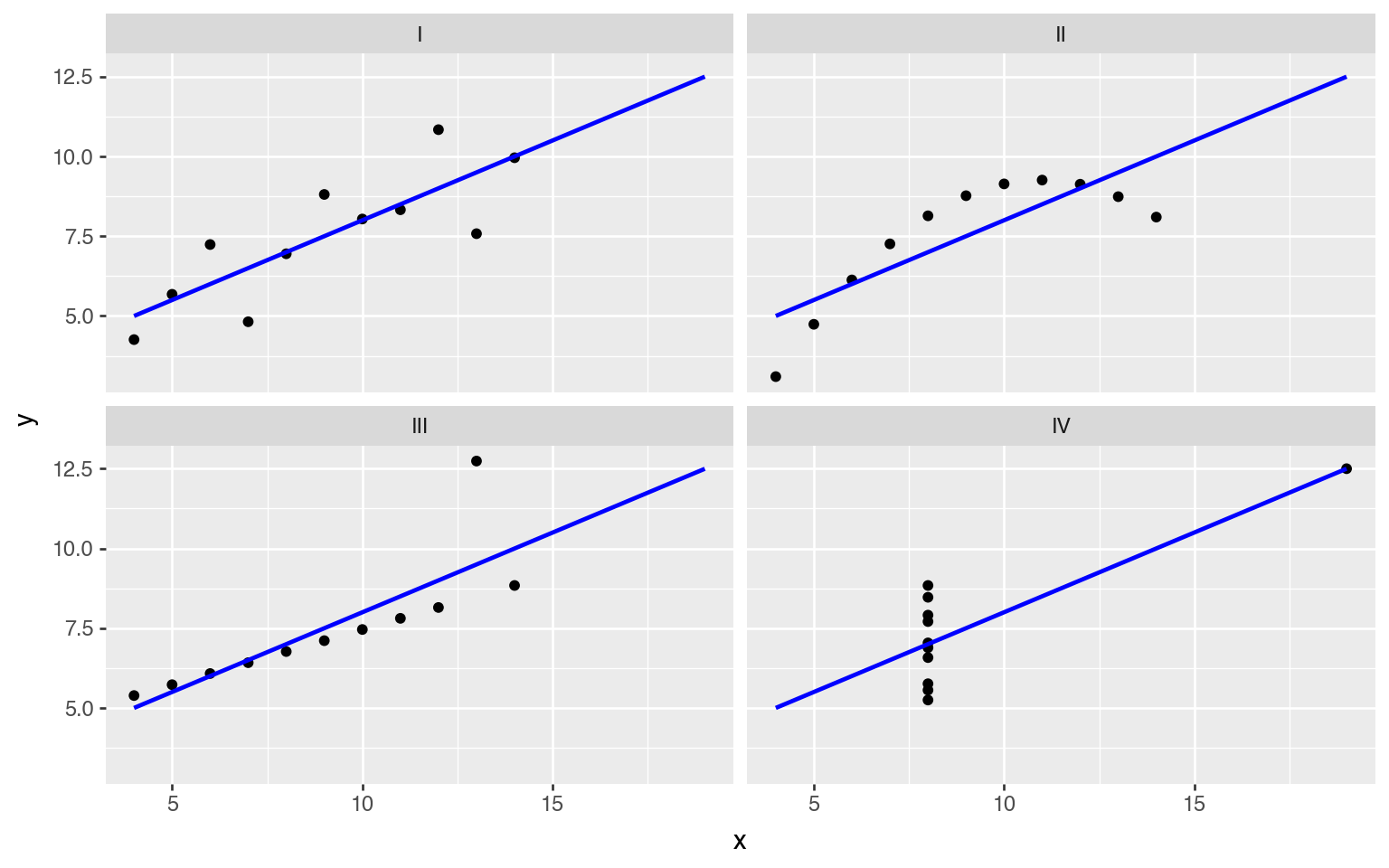 The column dataset indicates which rows belong to which dataset using the Roman numerals I through IV. (The Roman numerals are purely for visualization purposes.)